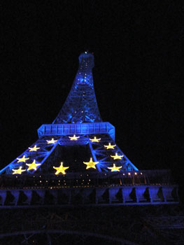 EUの旗の色にライトアップされたエッフェル塔。
